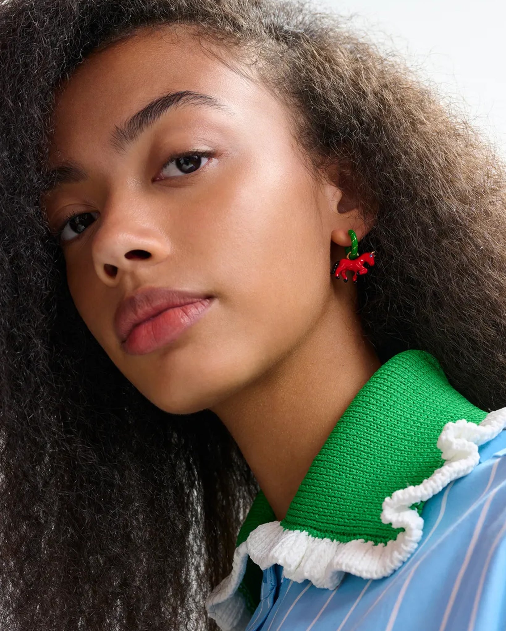 Hoop Earrings with Dinosaur and Strawberry Pendants (Blue/Gold)