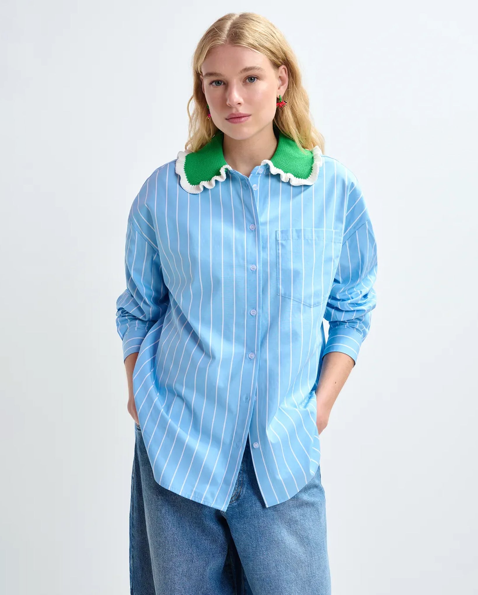 Striped Cotton Shirt with Crochet Ruffled Collar (Light Blue/Off-White/Green)