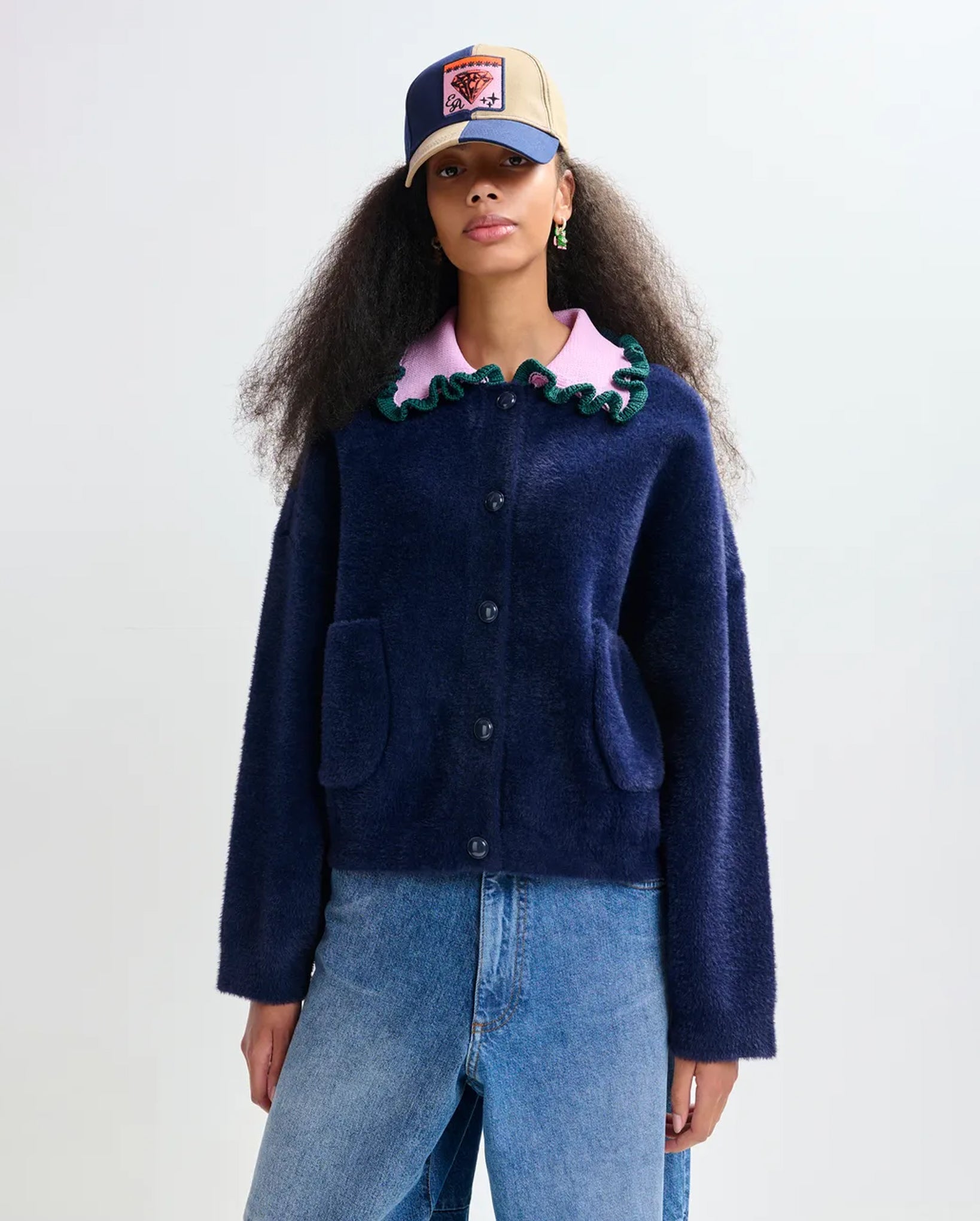 Cardigan With Contrasting Ruffle Collar (Dark Green/Navy/Purple)