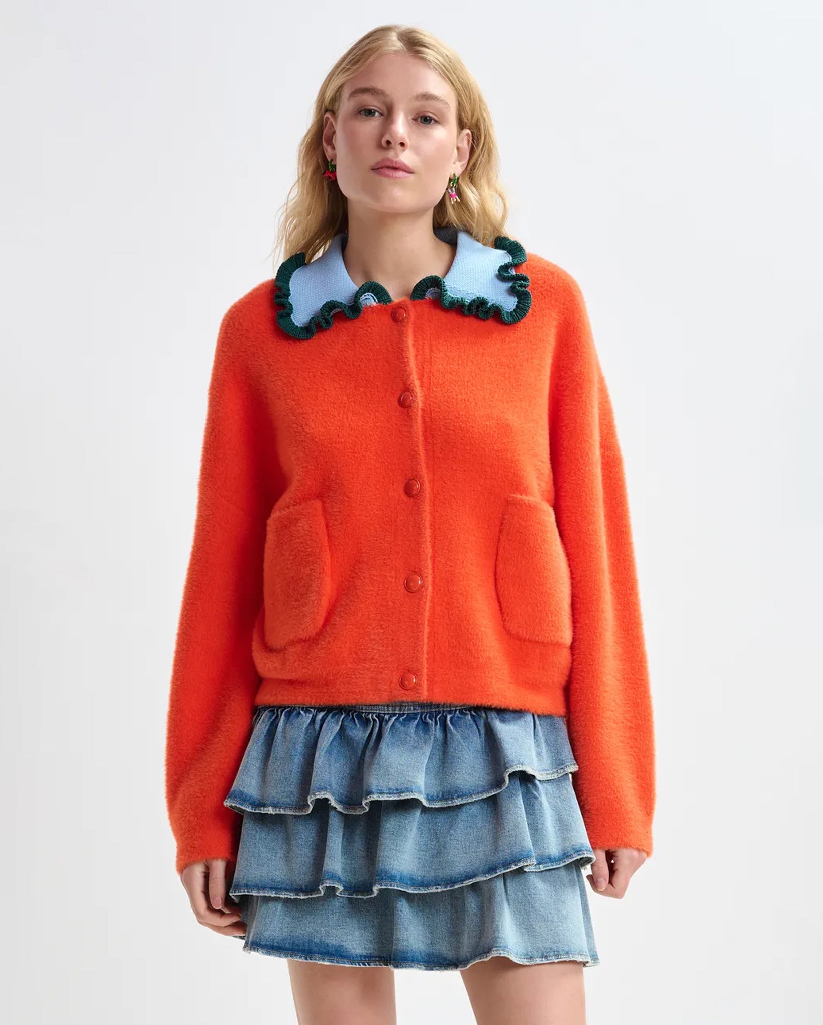 Cardigan With Contrasting Ruffle Collar (Dark Green/Light Blue/Orange)