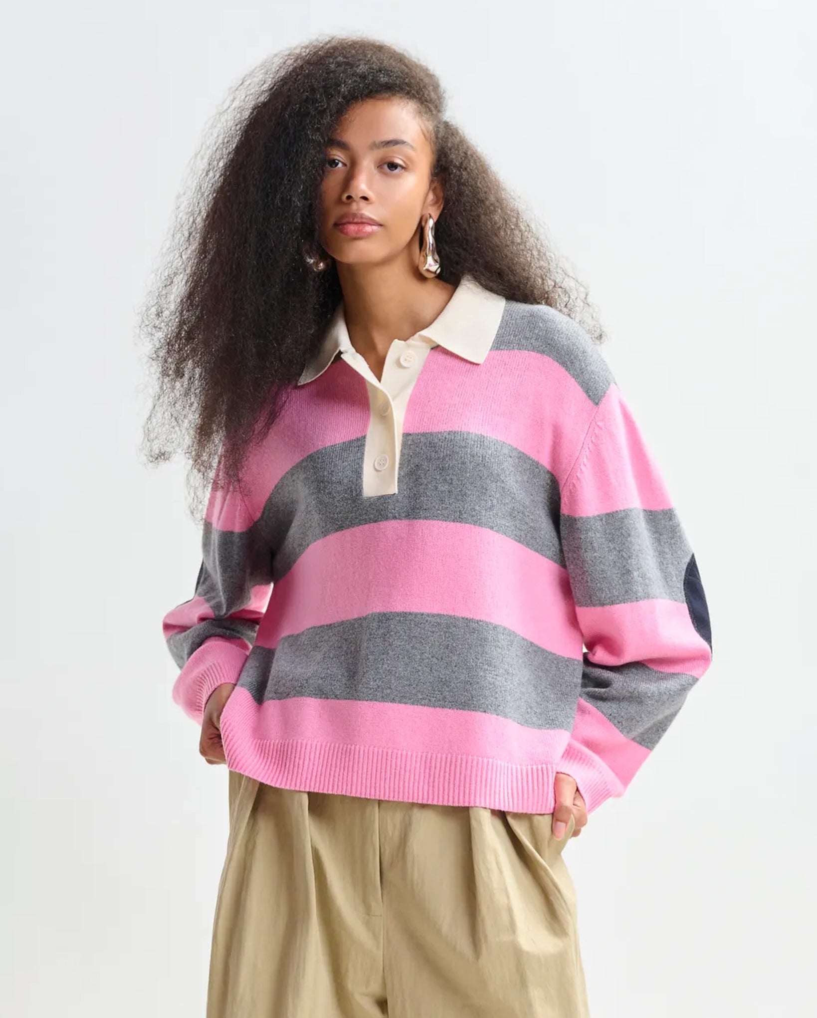 Striped Polo with Appliqué Patch (Grey/Off-White/Pink)