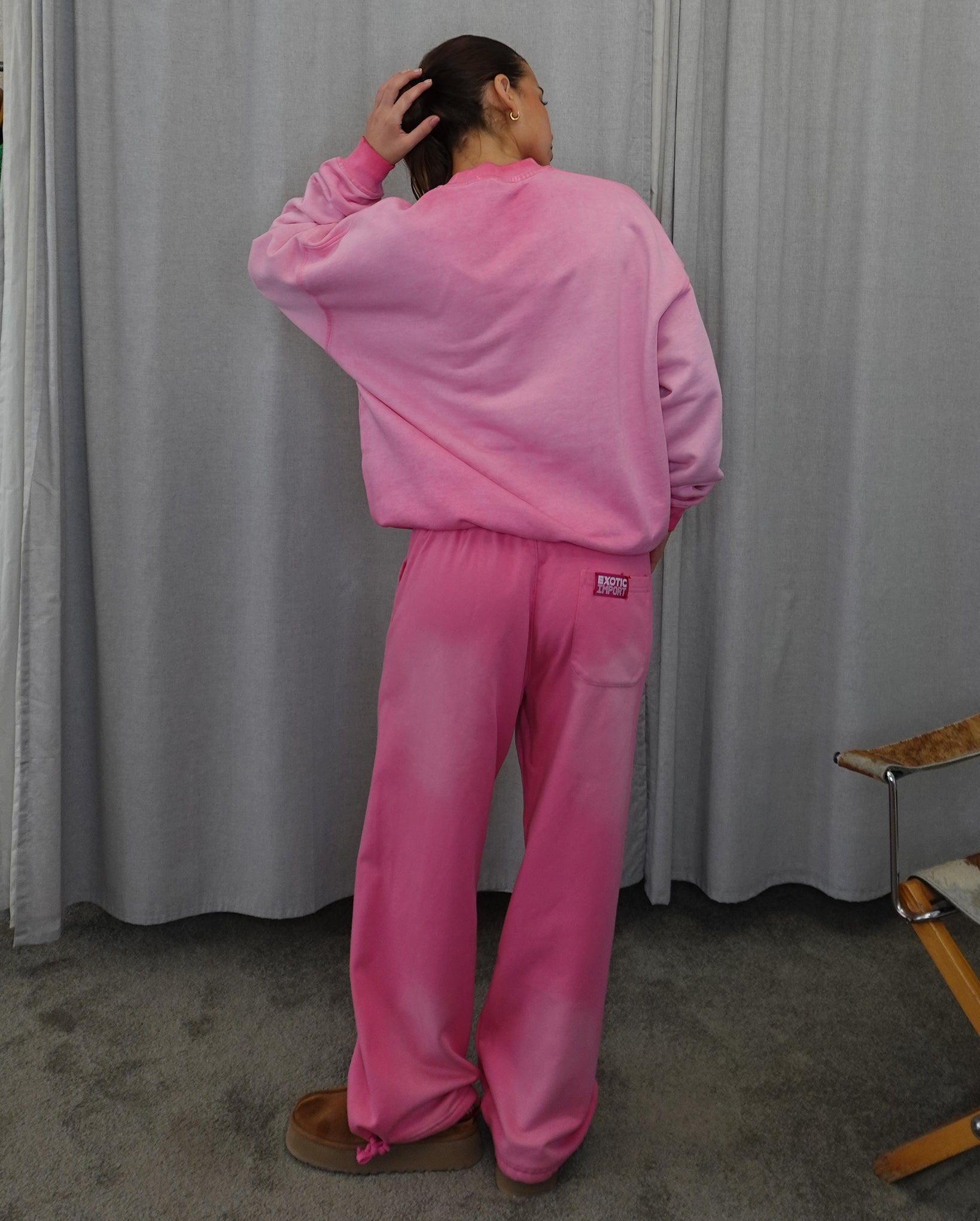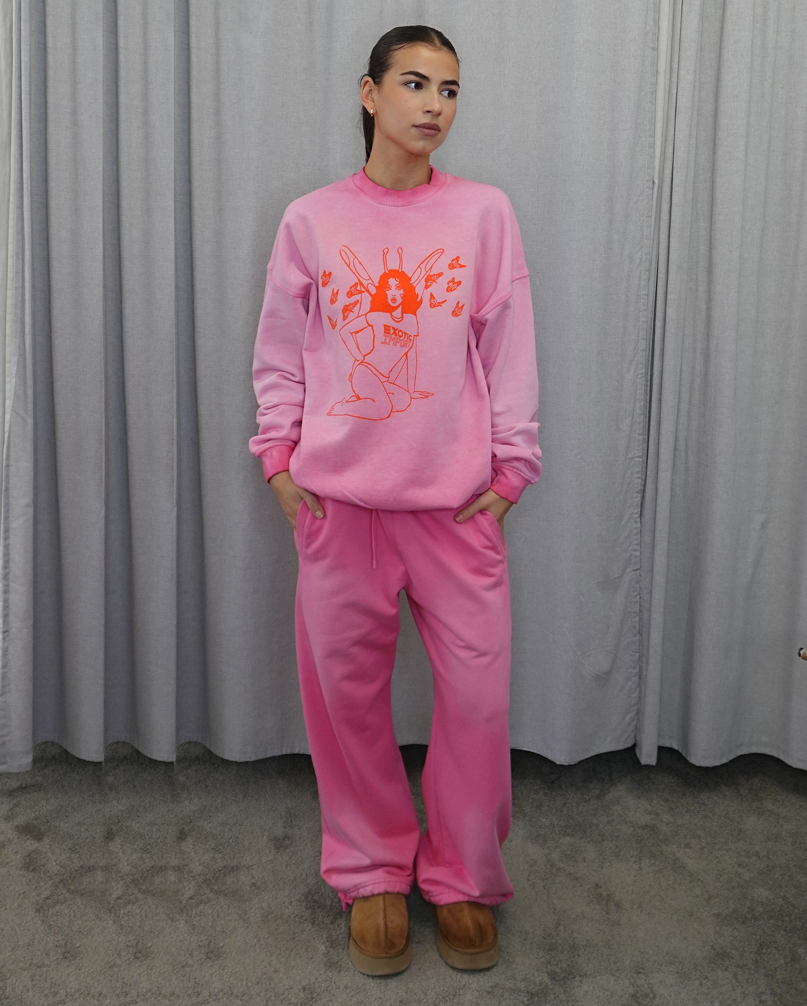 Pink sweatshirt with orange, screen-printed graphic. 430gsm. Model wears a size small.