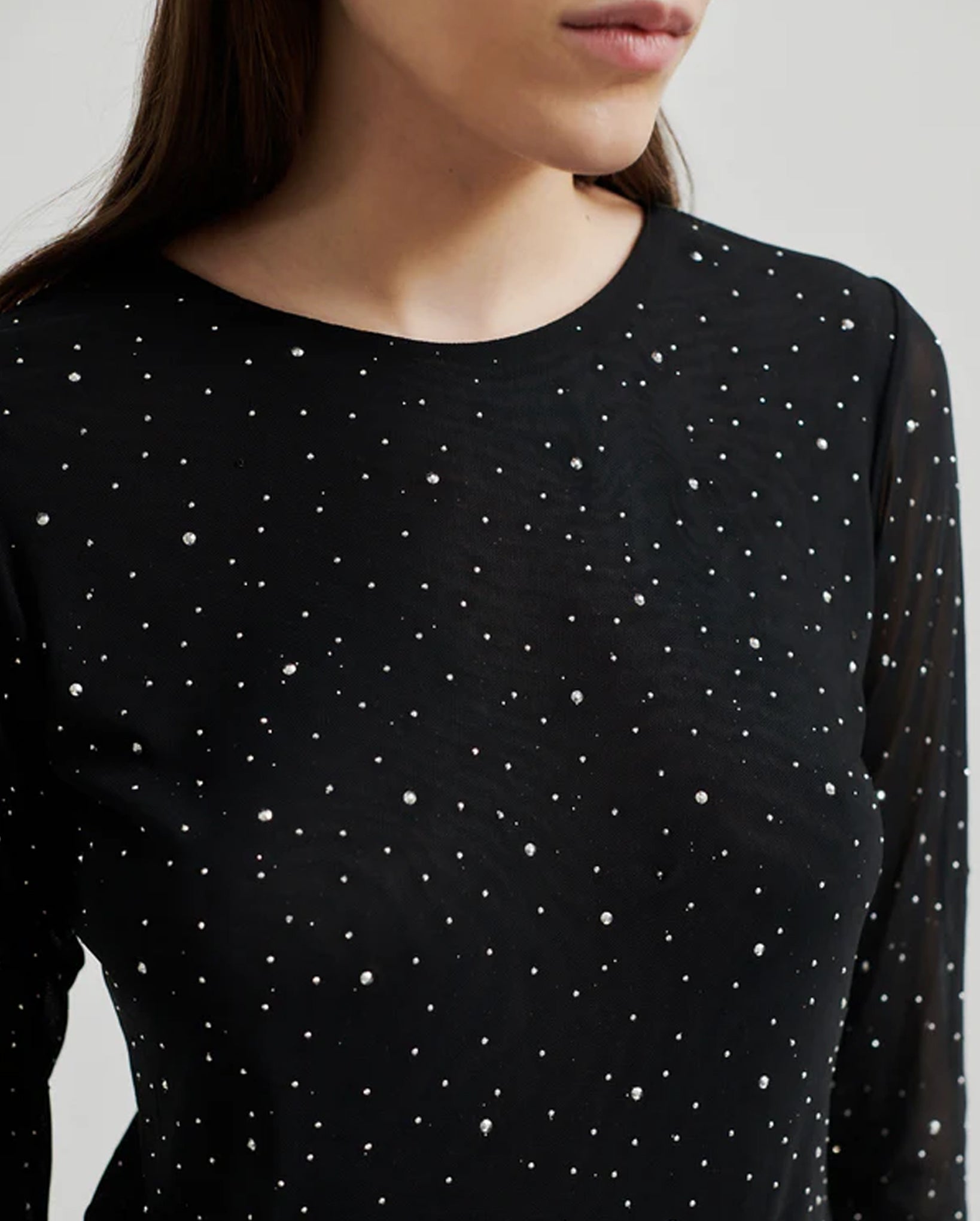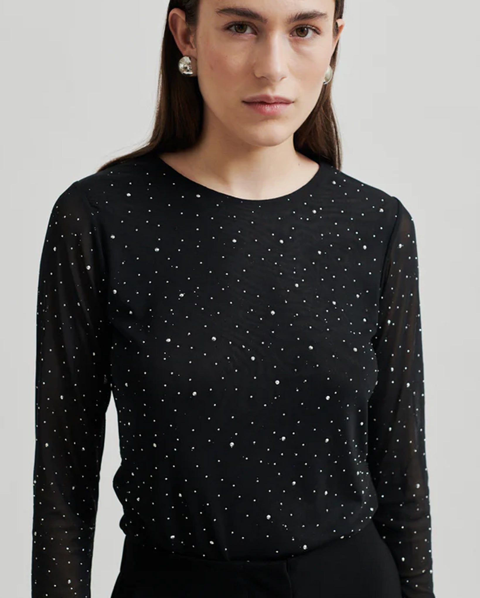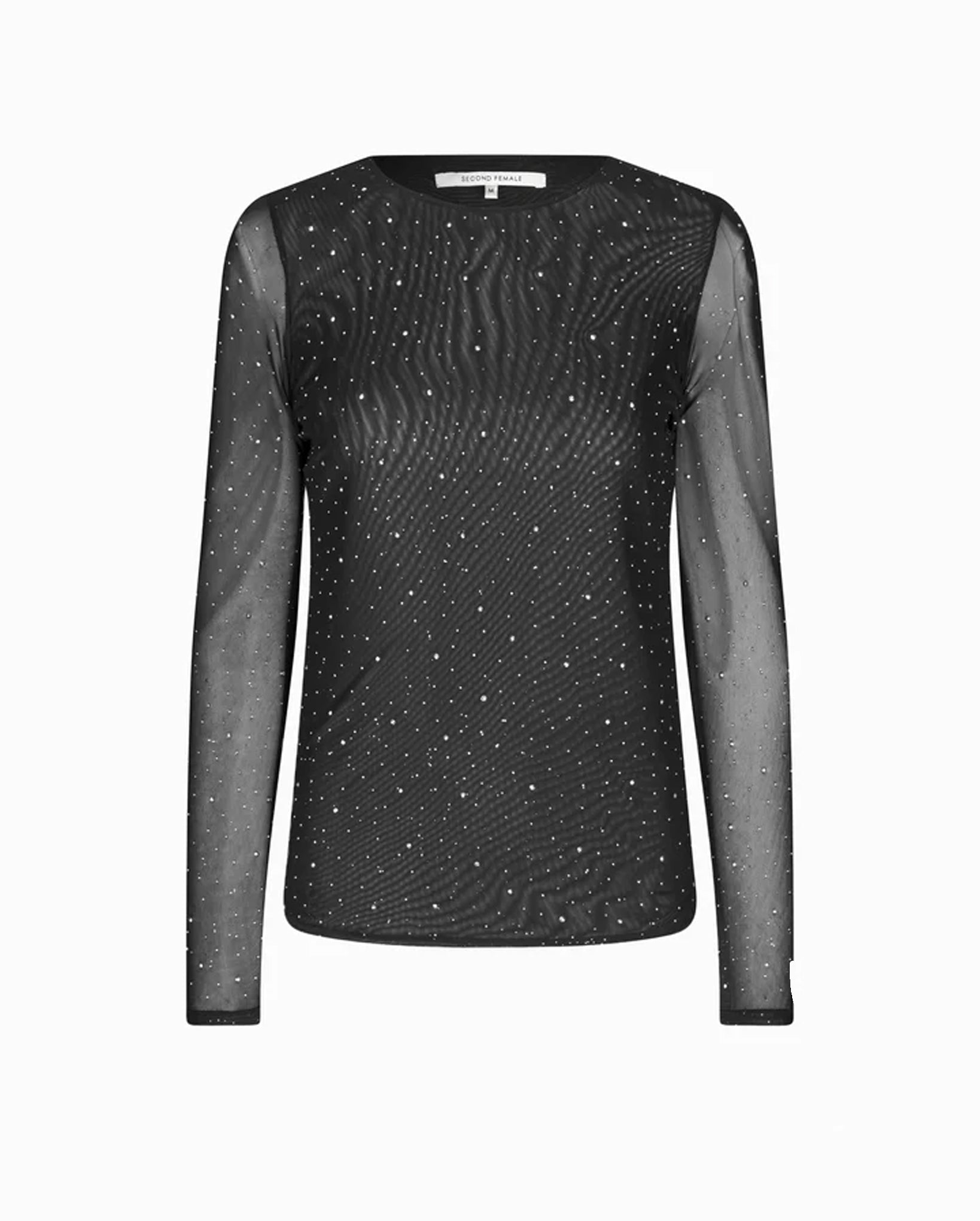 Introducing the Edgy O-Neck Tee in classic black. This Second Female top is the epitome of luxury with its stretchy, sheer mesh and all-over rhinestones in varying sizes. The round neck and long sleeves exude sophistication while the lined body and tight fit provide a sleek, elegant silhouette.