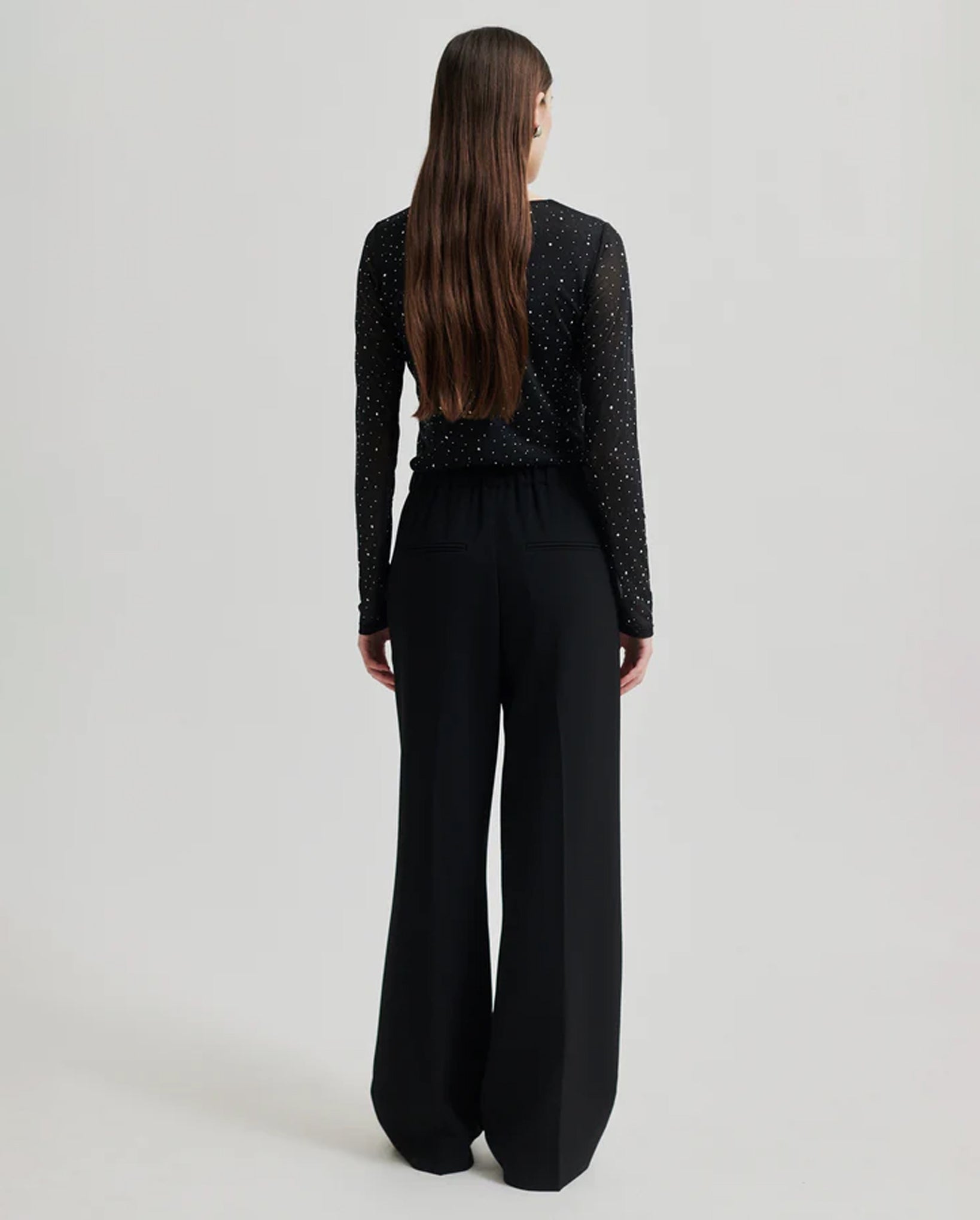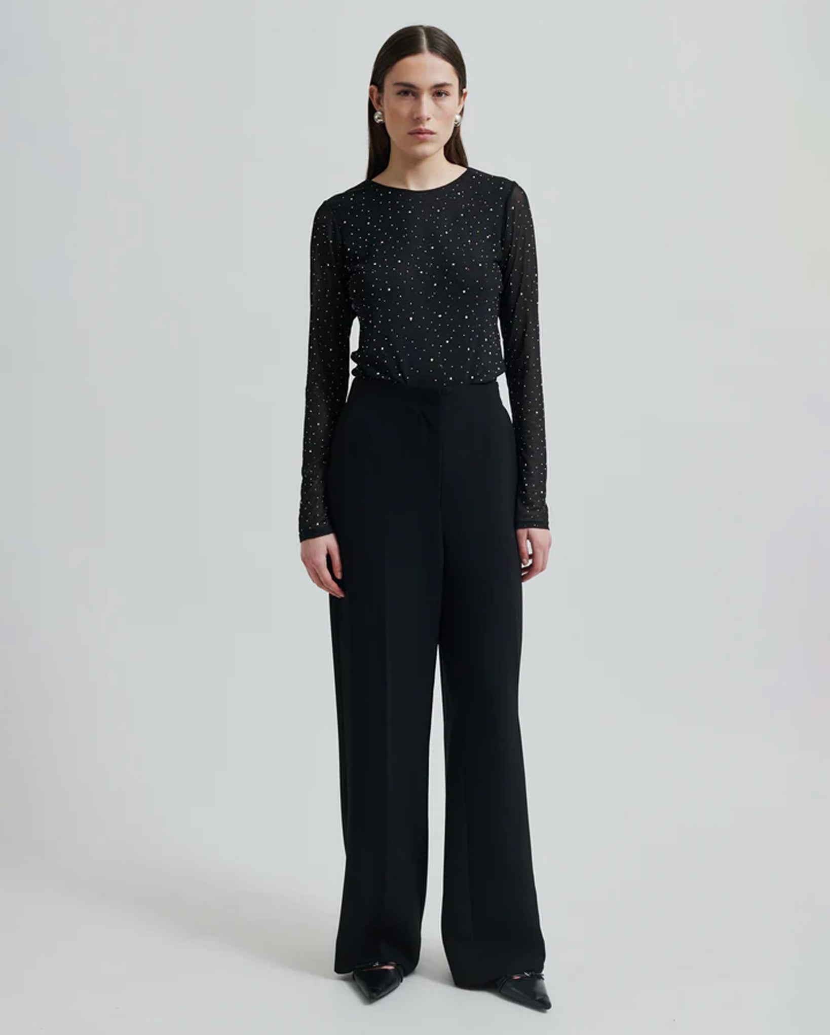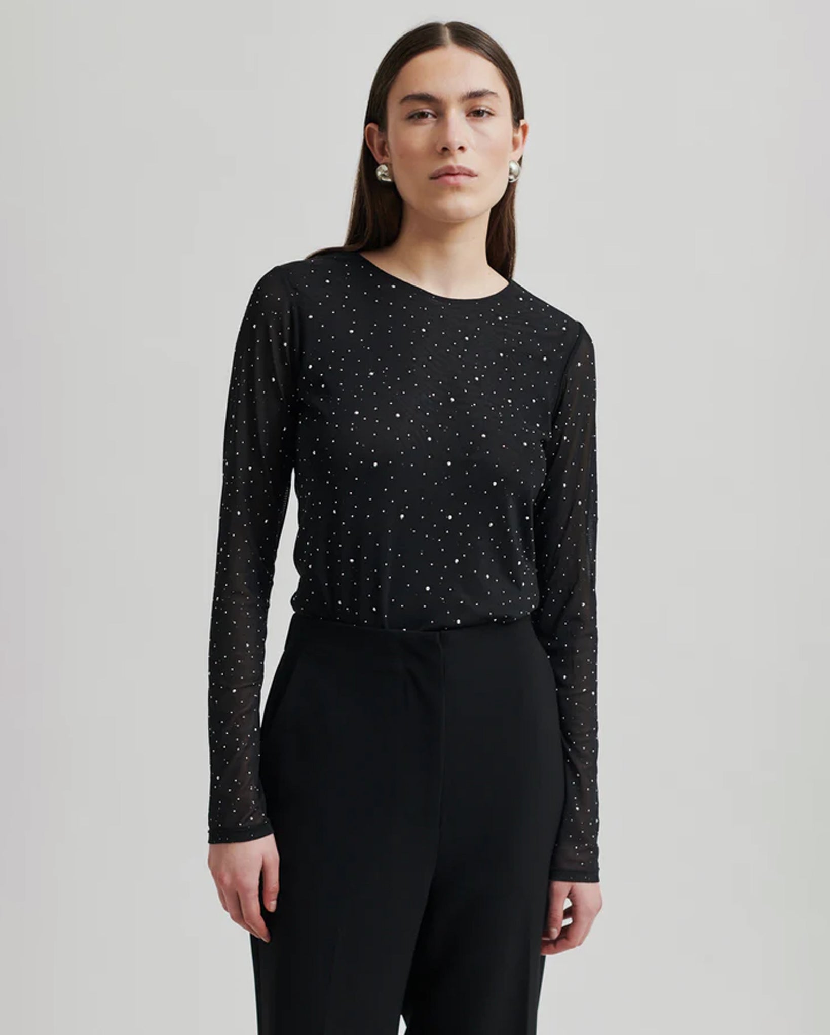 Introducing the Edgy O-Neck Tee in classic black. This Second Female top is the epitome of luxury with its stretchy, sheer mesh and all-over rhinestones in varying sizes. The round neck and long sleeves exude sophistication while the lined body and tight fit provide a sleek, elegant silhouette.