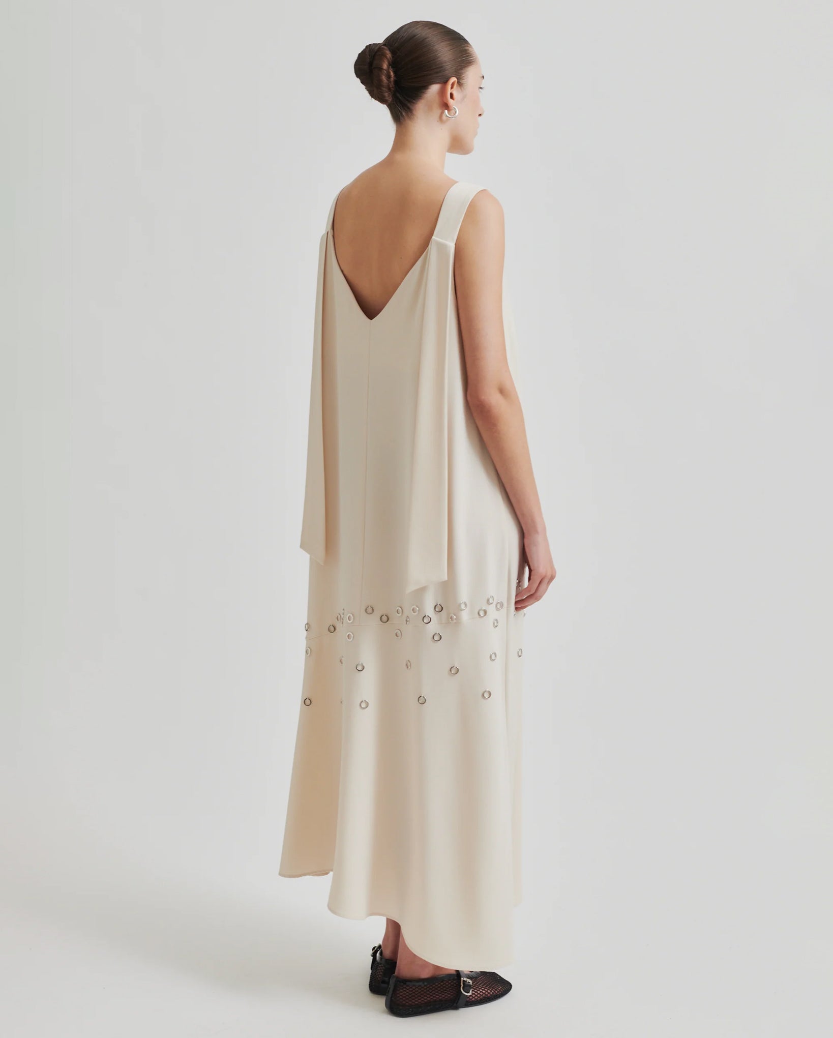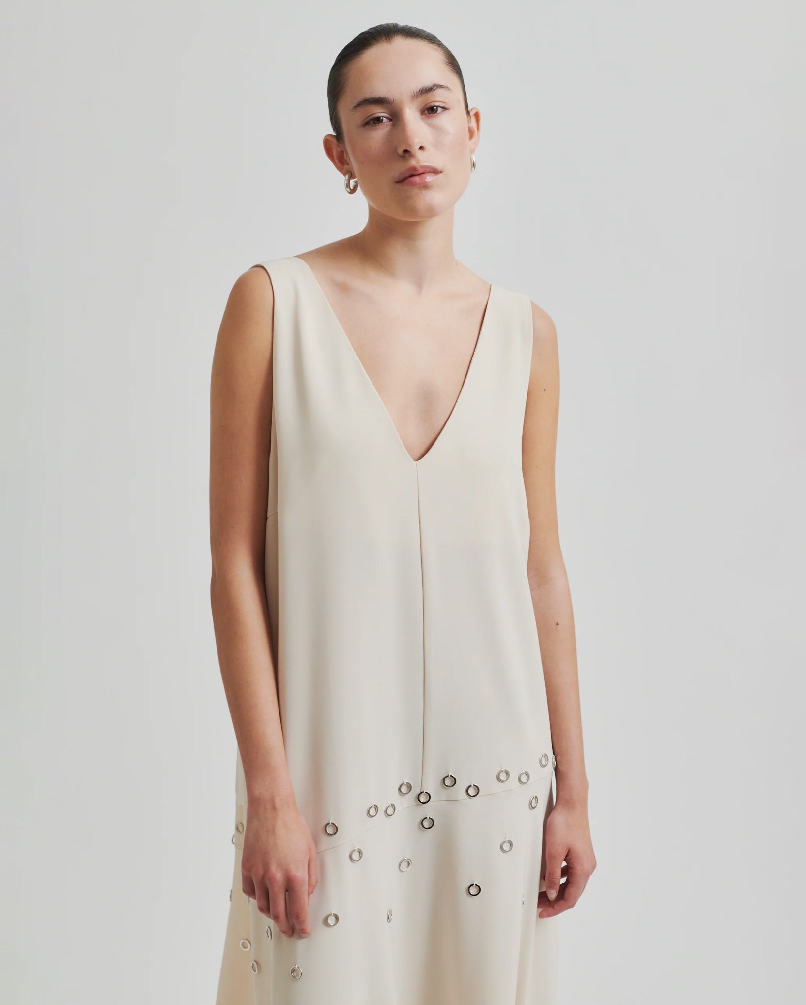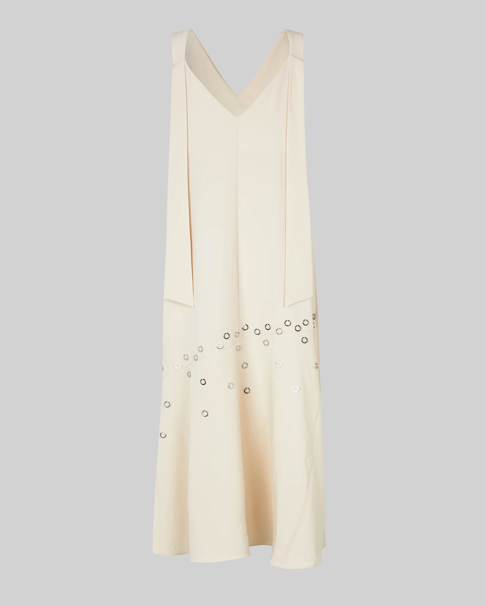 Second Female eyelet dress. The dress is made in a smooth and drapy fabric with eyelets scattered diagonally across the front and back. Featuring a V-neckline and shoulder straps with long pieces of fabric continuing down the back. Slit at one side. Regular fit at top with slightly looser skirt.