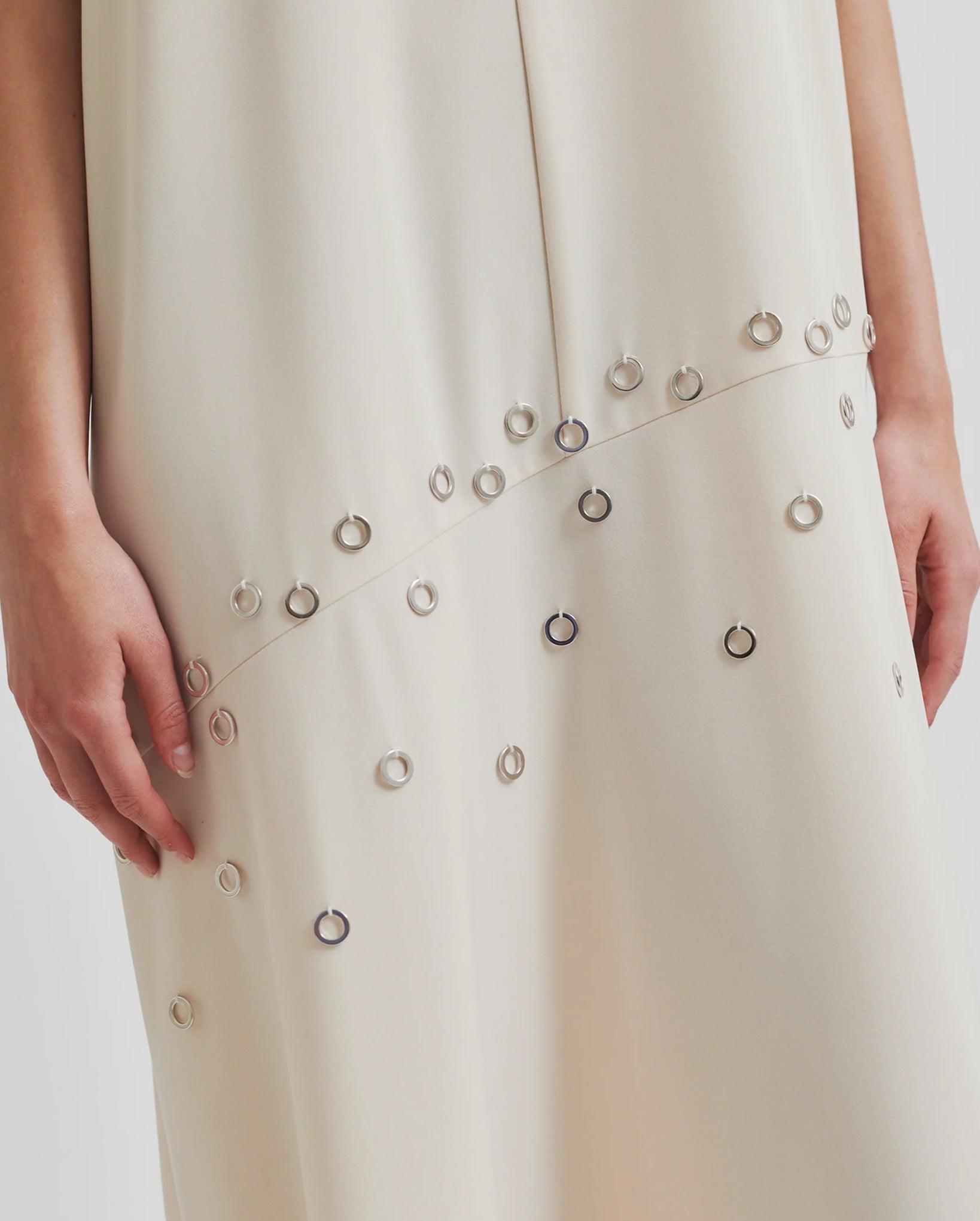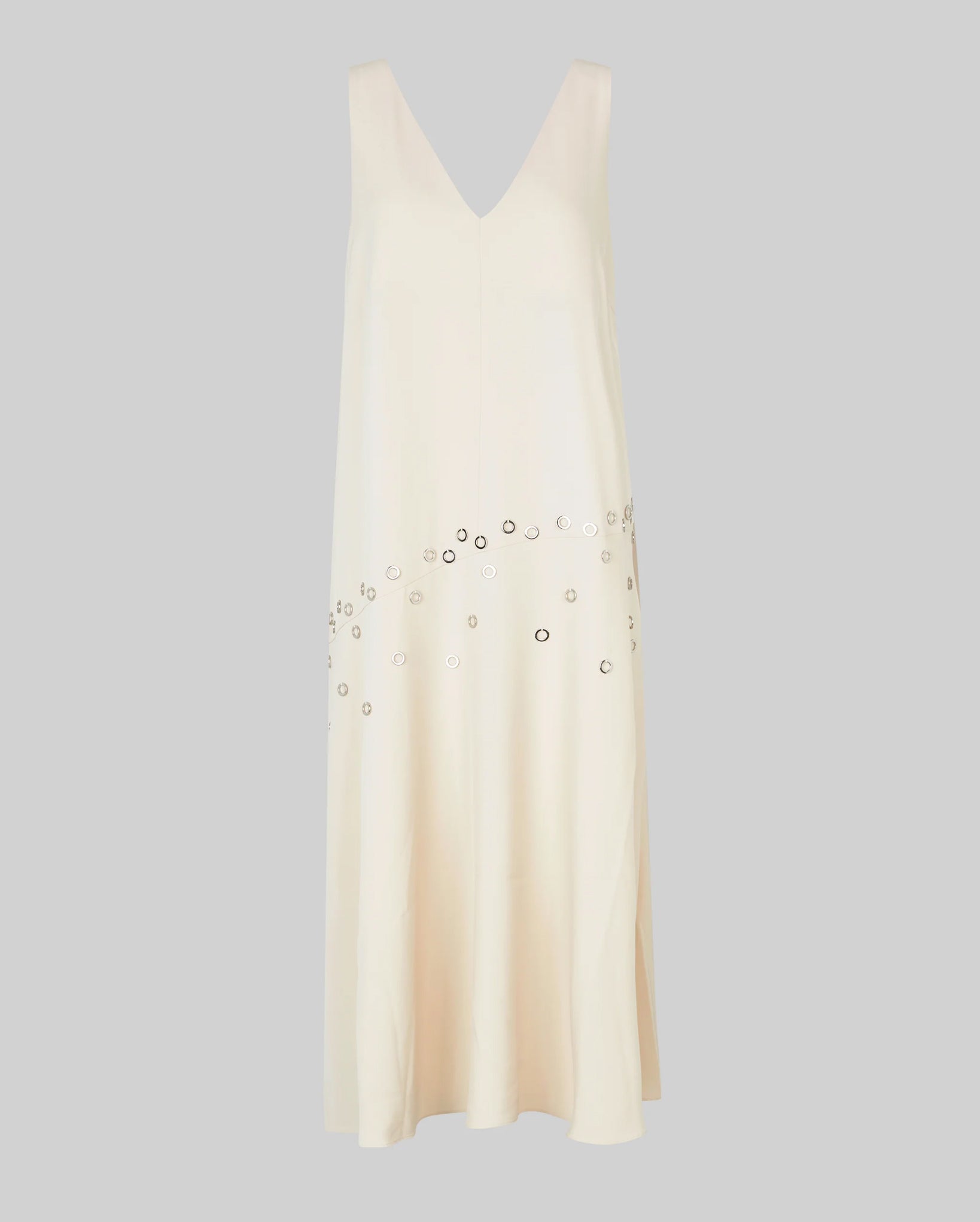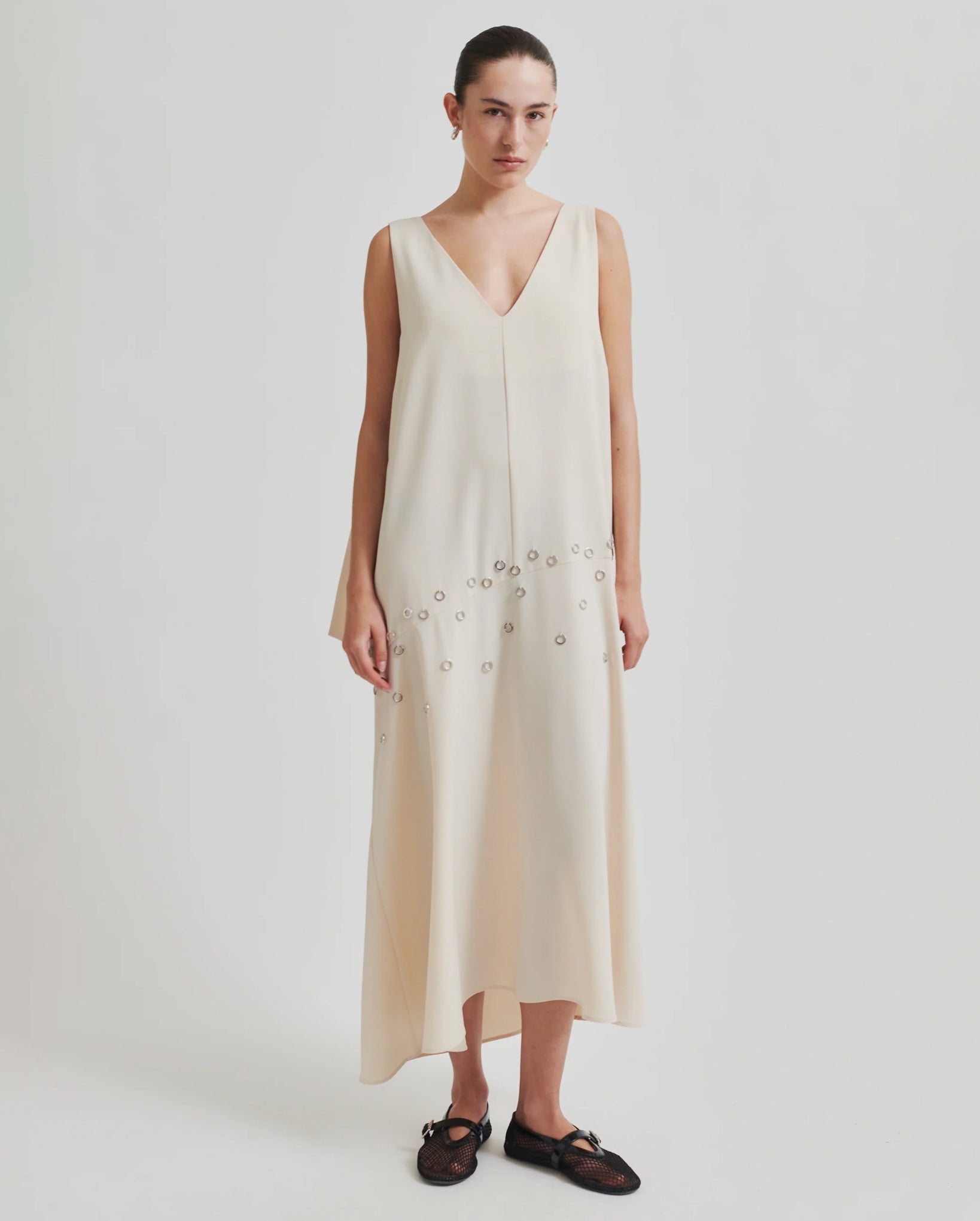 Second Female eyelet dress. The dress is made in a smooth and drapy fabric with eyelets scattered diagonally across the front and back. Featuring a V-neckline and shoulder straps with long pieces of fabric continuing down the back. Slit at one side. Regular fit at top with slightly looser skirt.