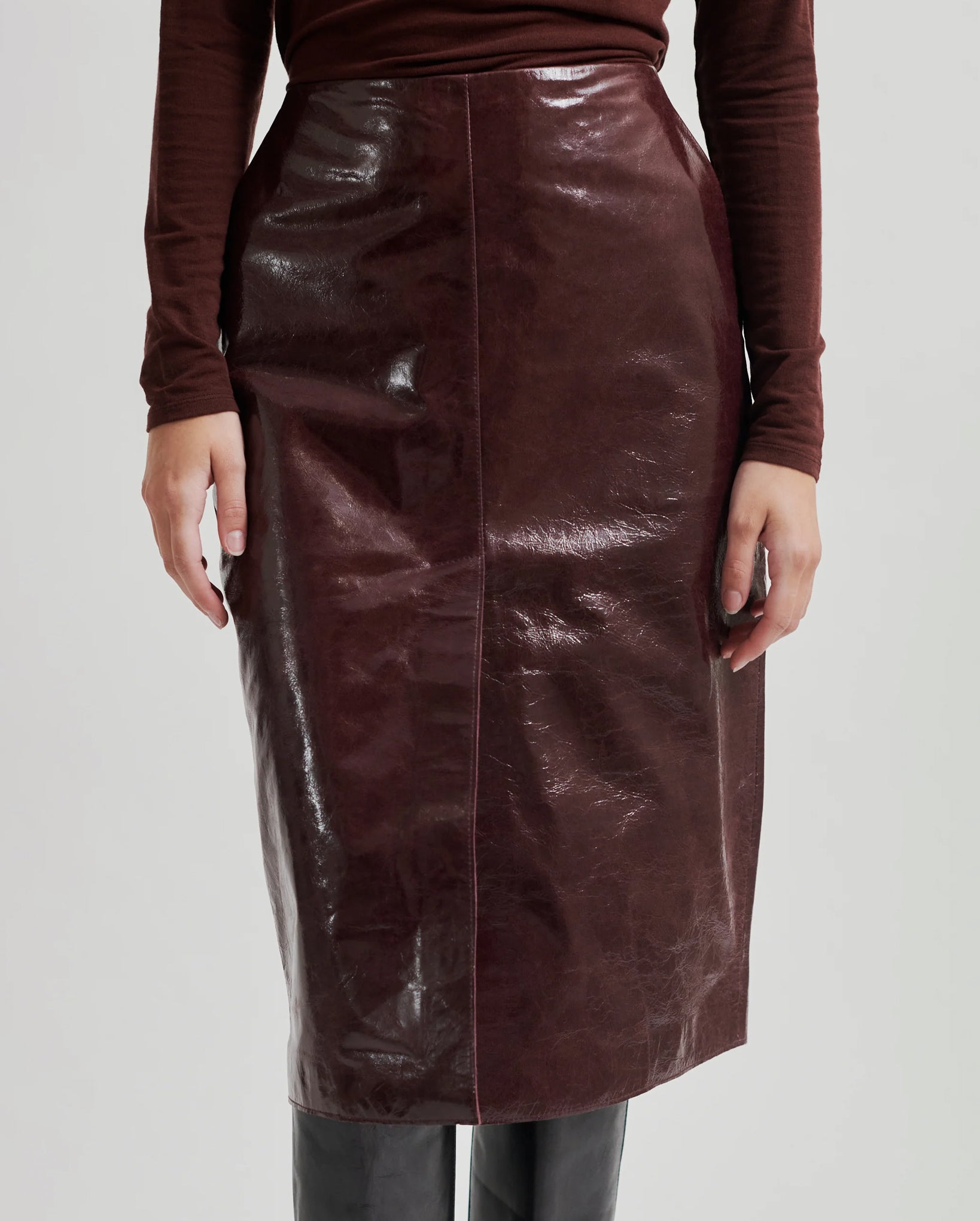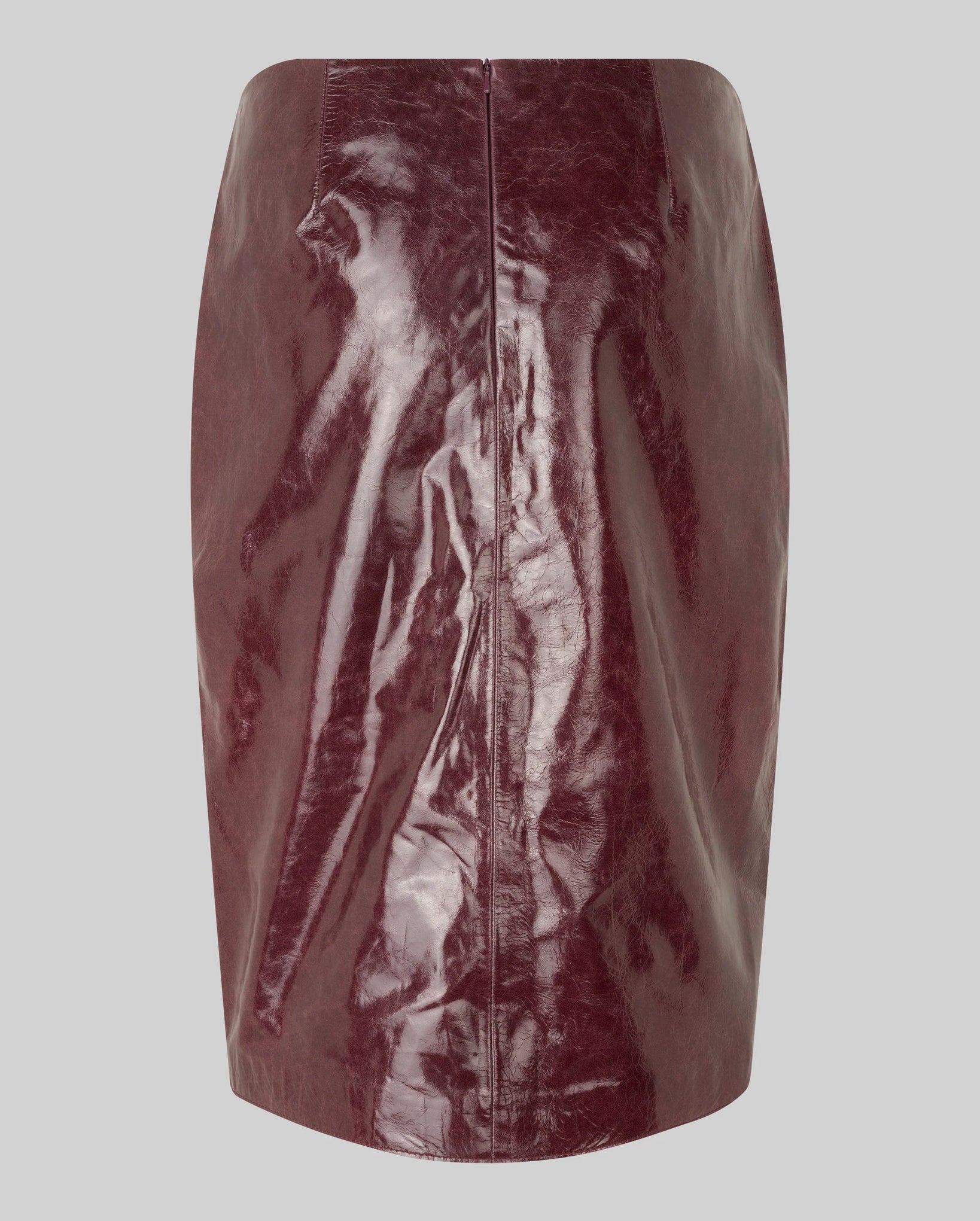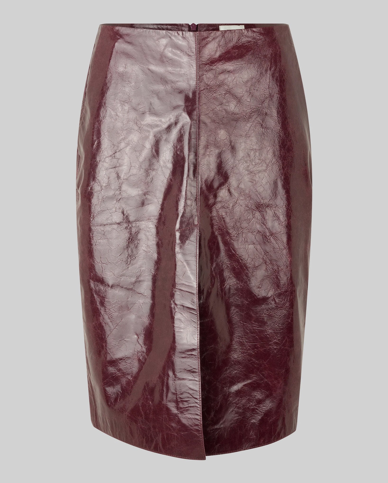 Second Female leather skirt. The skirt is made in smooth leather with a lustrous quality. Featuring a zip fastening at the back and two lined pockets. Slit at the front. Slim, straight fit.